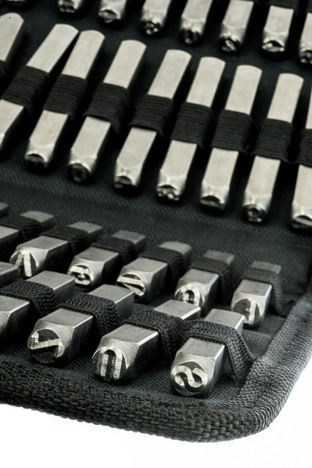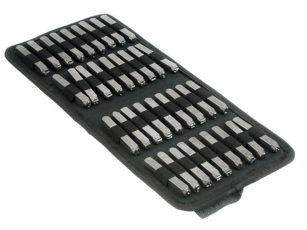 Our 36-piece steel metal alphabet letter & number die stamp tool kit comes in a Canvas Pouch storage case and is great for personalizing and identifying your stuff in steel, wood, leather etc.