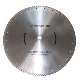 For smooth cleans cuts with no chipping. 4,500 RPM maximum, 80 m/s. 14" x 3.4mm x 8mm x 1" arbor.