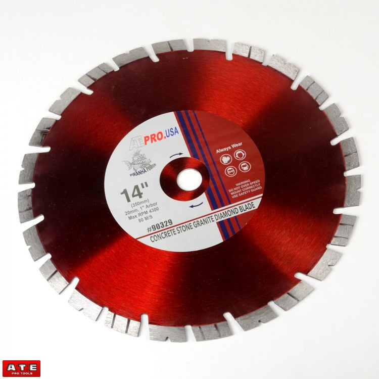• Powerful Blade, Fast Tough Cutting / Dry or Wet Use • Cut Hard Concrete, Hard Brick, Refractory Brick, Block, Aggregate, Quartz Stone, Field Stone, Pavers • New Design, New Power Experience • Max 15MM Turbo-Notched Combo Segment • Heavy Duty,Fast Cutting Rate, Better Blade Life • Includes arbor adapter • 14" / 350mm • 20mm, 1" arbor • Max RPM 4,300 • 80 m/s