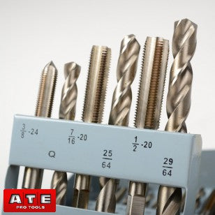 - 9 Taps: 6-40 UNF, 8-36 UNF, 10-24 UNC, 10-32 UNF, 1/4-28 UNF, 5/16-24 UNF, 3/8-24 UNF, 7/16-20 UNF, 1/2-20 UNF