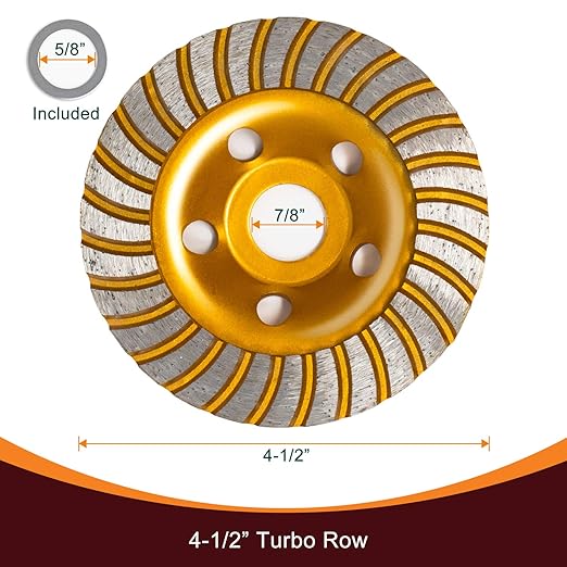 • Turbo cup wheel design - provides aggressive cutting action 45/50 diamond grit. • Universal 5/8" - 11 arbor size fits most angle grinders - no flanges, threads directly on the grinder. • 8 cooling venting holes - reduces core heat for extended blade life. • Max Speed: 12,000 RPM • Usage: concrete, field stones, brick, granite, marble, etc.. Manufacturer color and details may vary.