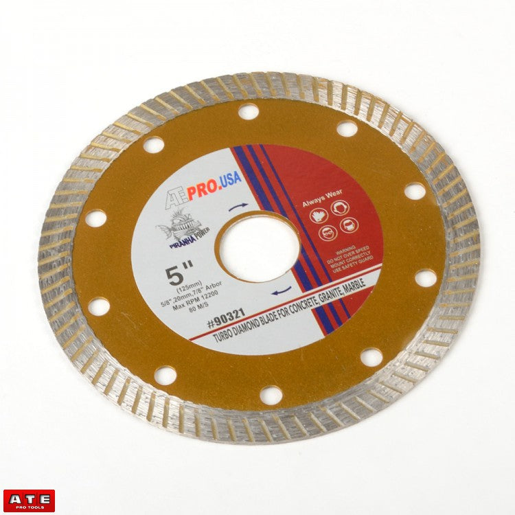 • Ideal for granite, marble, porcelain, stone and different type of tiles and masonry materials. • Constant contact with material delivers a smoother, cleaner finish than segmented blades. • Optimum bond matrix provides a faster, longer, and smoother cut. • Includes 2 arbor adapters. • 5" / 125mm • 5/8", 20mm, 7/8" arbor • Max RPM 12,200 • 80 m/s, Manufacturers color and details may vary