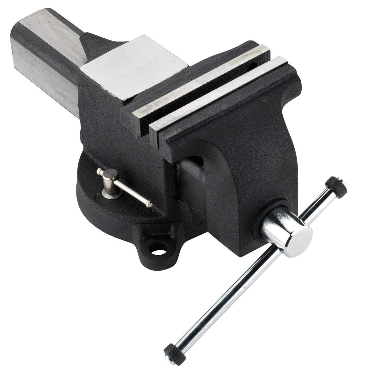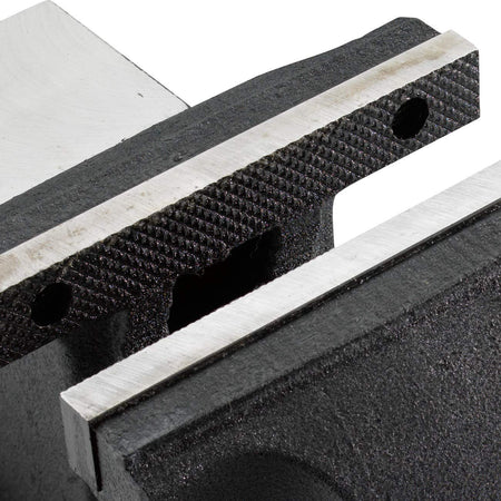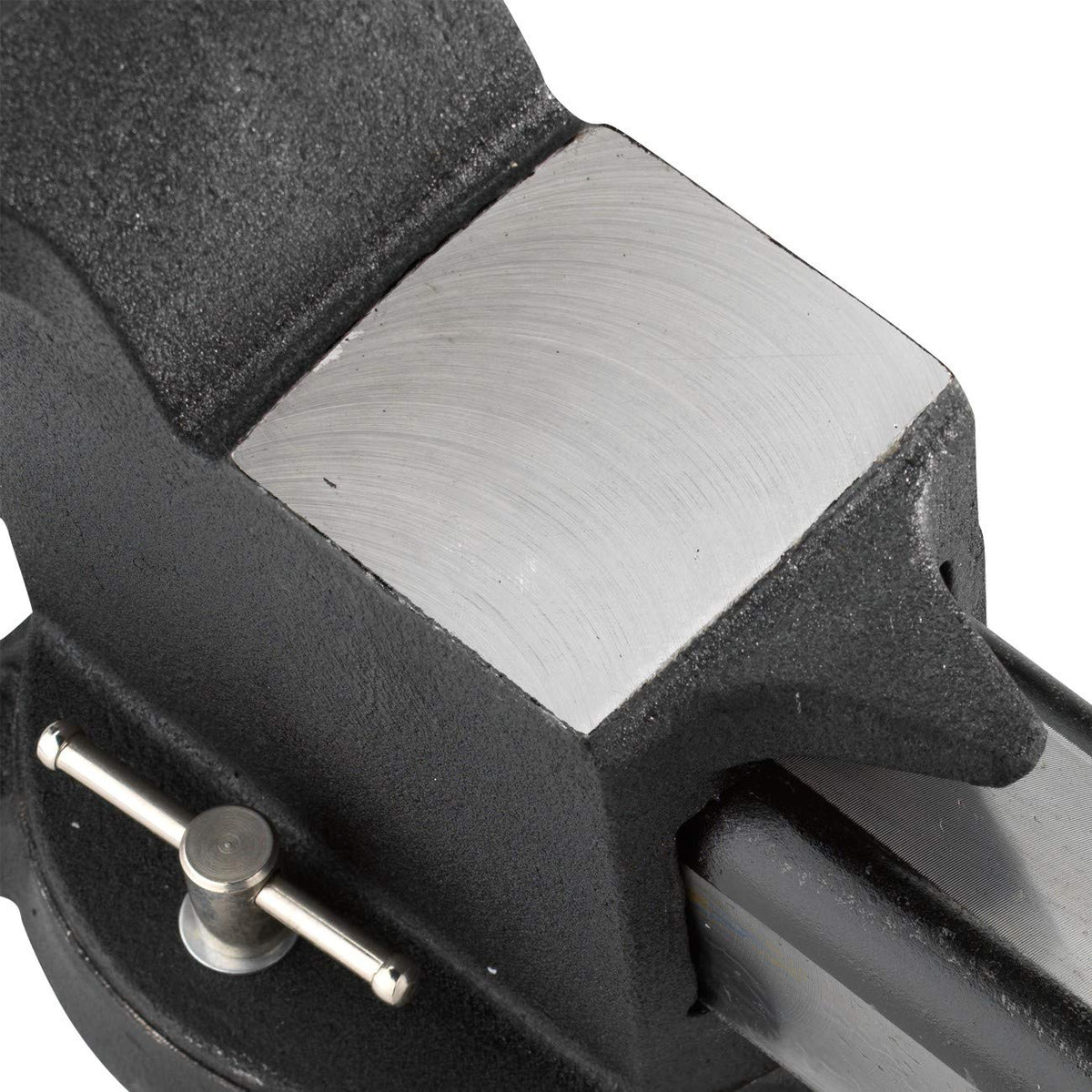 Heavy duty steel vise, 6-inch model features with a replaceable steel serrated top jaws. 360 degree swivel base with 2 lockdown. Permanent pipe jaws and a large reinforced anvil. The vise is made with durable quality S37C carbon steel with 60,000 PSI tensile, finished with a wrinkle paint. Hardness of the vise jaw is HRC25-HRC30. The max jaw width is 6-inches, max open width is 6-inches and the throat depth is 3-inches. Color may vary
