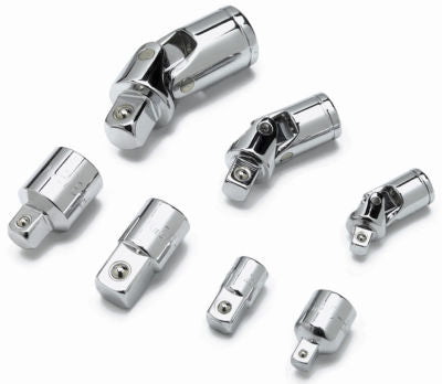 Heavy Duty 7 piece Chrome Vanadium Steel, Fully Chrome Plated Finish, Universal wobble U-Joint Sizes 1/4", 3/8" And 1/2", Adapter Sizes 1/2" To 3/8", 3/8" To 1/2", 3/8" To 1/4" And 1/4" To 3/8"