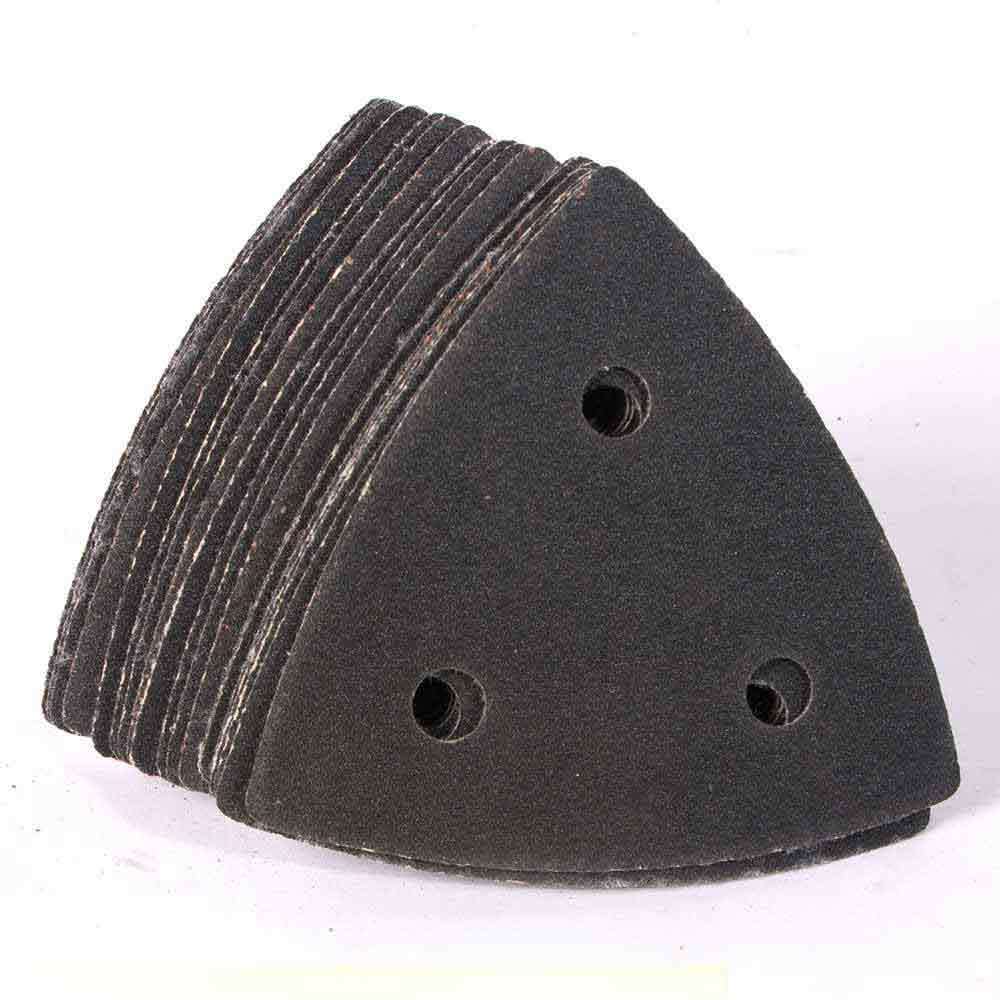 80 Pack Universal Hook and Loop Sand Paper For Oscillating Multi-Tools and Others 3-2/8" Size. 20 pack each of 60, 120, 180 & 240 grit triangular sanding pads. They are perfect to use in smaller hard to get areas where you need to sand old paint or rust on almost any surface. Ideal for corners and edges. You can use it on wood, fiberglass, and metals. They are 3 2/8 of an inch per side. They fit most triangular backer pads that usually come with your multi tool and fasten via hook and loop. Also known as Hook & Loop.