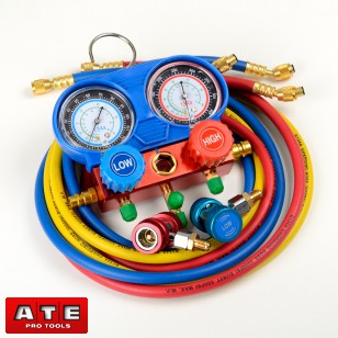Our A/C Manifold Gauge Set is designed to test automotive air conditioning systems (using R134A only) by comparing the "high side" and "low side" pressure reading to the vehicle manufacturer’s A/C system specifications. The high-pressure gauge measures compressor discharge pressure, and the low-pressure gauge measures suction. Set includes quick-disconnect valves, sight glass, high-pressure safety valve, color-coded gauges, valves and hoses.