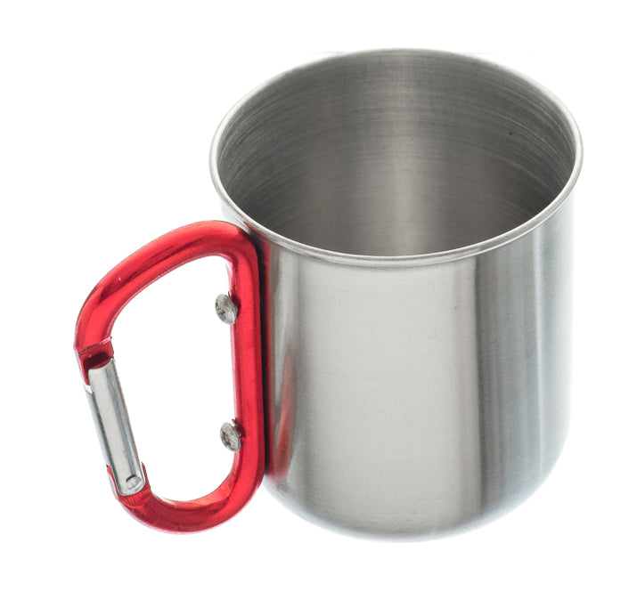 304 stainless steel carabiner travel Mug measures 4" x 3" x 2-3/4" and holds a capacity of 10 Fl. Oz. Attach-and-go with the convenient carabiner handle to your backpack, gear, and more while outdoors hiking, camping, or traveling. The single-walled stainless steel design allows for Quick boiling over a direct flame. Our Mug is the perfect size to hold a short order of your favorite drink while at home or out in the wilderness, or on an outdoor Adventure. Carabiner travel Mug is great for indoors, or outdoors while hiking, camping, and more easily attach to your backpack or gear with the carabiner handle material: single wall 304 stainless steel can boil over a direct flame volume 10 oz. Or 300 ml weight: 2.5 oz.