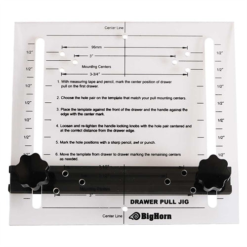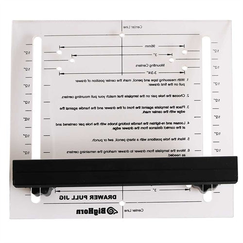 Cabinet drawer pull drilling jig. Precisely mark position for drawer pulls Mark center line, choose boring width needed and position wooden guide for correct spacing and lock. Align jig over center line & mark holes. Remove jig and drill. Jig measures 7" wide by 6" tall.