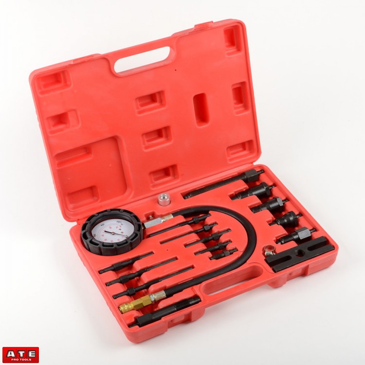 Measures from 0-1000PSI, 0-70BAR • Dial Gauge with 340mm host and pressure relief button • Includes 14 adaptors and 1 H Fitting: Glow Plug Adaptor 91mm M10x1.00; Glow Plug Adaptor 119mm M10x1.00; Glow Plug Adaptor 135mm M10x1.25; Glow Plug Adaptor 118mm M22x1.50; Glow Plug Adaptor 113mm M10x1.00; Glow Plug Adaptor 102mm M10x1.00; Glow Plug Adaptor 83mm M10x1.00; Glow Plug Adaptor 64mm M10x1.25; Glow Plug Adaptor 47mm M12x1.25; Injector Adaptor 88mm M24x1.50; Injector Adaptor 73mm M22x1.50; Injector Adaptor 63mm M24x2.00; Injector Adaptor 75mm M20x1.50; Screw Adaptor 160mm; H Fitting