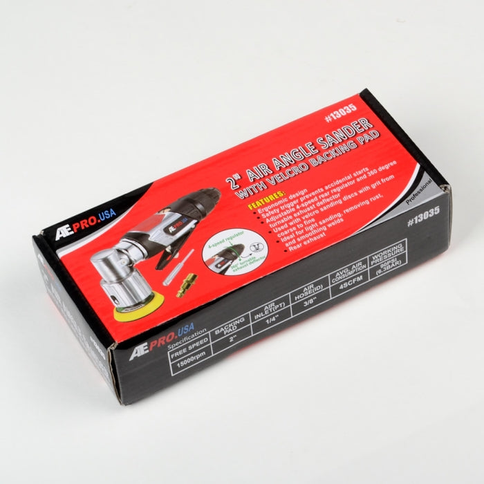 FEATURES: • Ergonomic design • Safety trigger prevents accidental starts • Adjustable 4-speed rear regulator and 360 degree turn able exhaust deflector • Used with hook and loop sanding discs with grit from coarse to fine • Ideal for light sanding, removing rust, and smoothing welds • Rear exhaust SPECIFICATIONS: • Free Speed: 15,000 RPM • Backing Pad: 2" • Air Inlet (PT): 1/4" • Air Hose (ID): 3/8" • Avg. Air Consumption: 4 SCFM • Working Pressure: 90 PSI (6.3 BAR). Manufacturer color, looks and details may vary.
