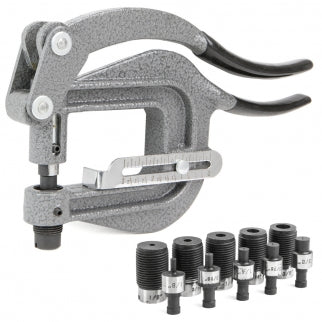 - Punches 6 sizes of precision round holes in sheet steel, aluminum, plastic, brass. Compound leverage for easy operation. Ideal for auto body and aviation repairs. Balanced tool with curved, easy-grip handles.