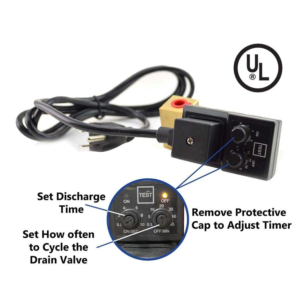 Electronic automatic timer moisture drains for air compressors and air tanks. This drain can be set to drain every 30 seconds up to every 45 minutes and the valve will stay open for 0.5 seconds up to 10 seconds, they are most commonly set to drain for about 3 seconds every 30 to 45 minutes on air compressor applications, this valve also has a test button to drain it manually anytime. This drain plugs into a regular 110-volt outlet and the cord is 6ft long.