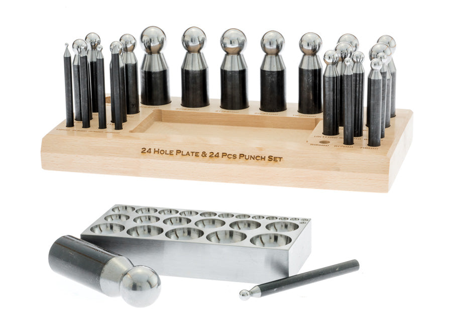 This set includes 24 steel dapping punches ranging from 2-24 mm in diameter; a dapping block flat with 24 depressions ranging from 2-24 mm in diameter; and a hardwood stand to hold all the pieces.
