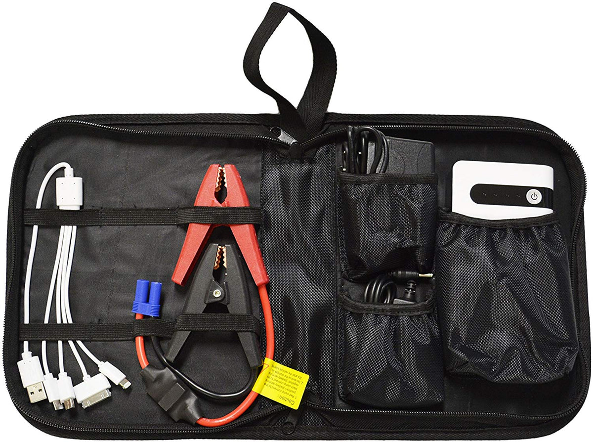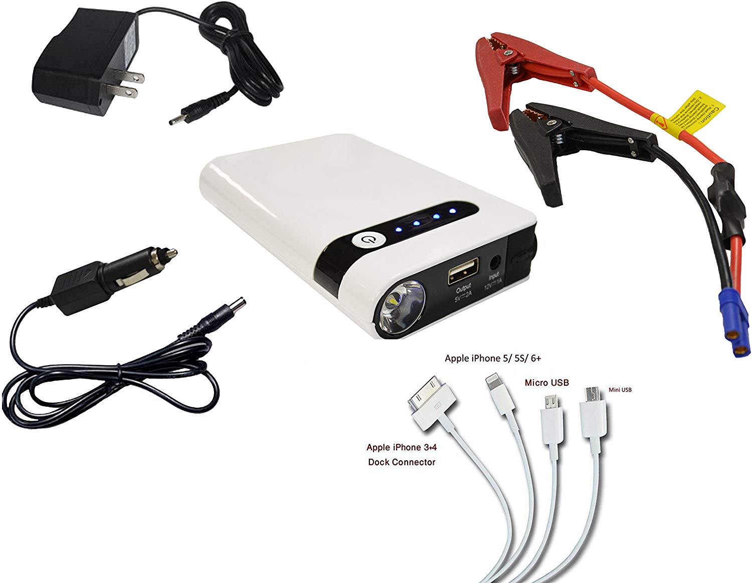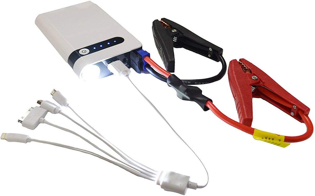 This pocket sized jump starter can be used to jump start cars, motorcycles, boats and even forklifts. It also servers as an emergency battery charger for tablets, smart phones cameras and even PSPs. The unit comes with a standard wall charger as well as a 12 Volt car charger so you can easily keep the pocket jumper battery pack charged no matter where you are. The battery pack itself has an integrated high powered LED flashlight with a flashing SOS light option for emergency roadside or distress scenarios. This unit even comes with the 12Volt vehicle jumper cables to attach directly to your vehicle's battery for a quick jump start. Also included is a charging dock for: Mini USB, Micro USB, i phones: 5, 5S and 6+ and even the older I-pods and i phones such as i phone 3 and 4. 4 LED Indicator Lights Display Current Power Reading Clearly Showing Battery Pack Power (4-LEDs Light Indicate Full Charge and Ready to Jump Vehicle). Overall Jumper Battery Dimensions: 5-1/8" x 3" x 1". Manufacturer's details and look may vary.