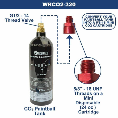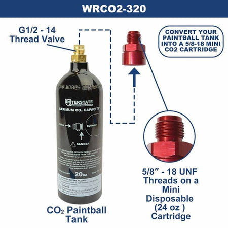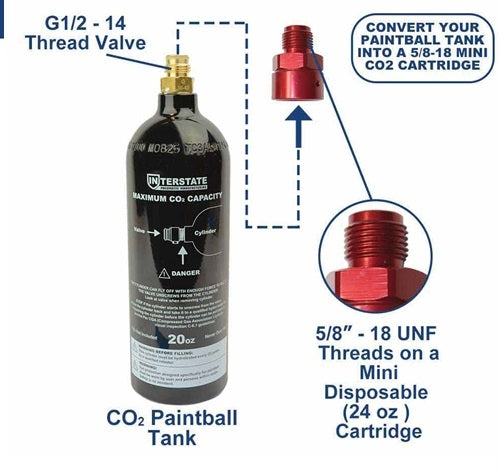 Converts a Paintball Tank to CO2 Disposable Mini Tank. So you can use your standard paintball tank in applications that require disposable Co2 cartridges.