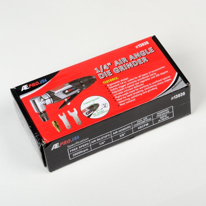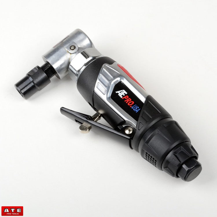 FEATURES: • Ergonomic design • Standard 1/4 in. collet for all types of accessories • Safety trigger prevents accidental starts • Adjustable 4-speed rear regulator and 360 degree turnable exhaust deflector • Right-angle head for working in confined spaces • Ideal for weld breaking, smoothing sharp edges, deburring, polishing and grinding • Rear exhaust SPECIFICATIONS: • Free Speed: 20,000 RPM • Air Inlet (PT): 1/4" • Air Hose (ID): 3/8" • Avg. Air Consumption: 4 SCFM • Working Pressure: 90 PSI (6.3 BAR)