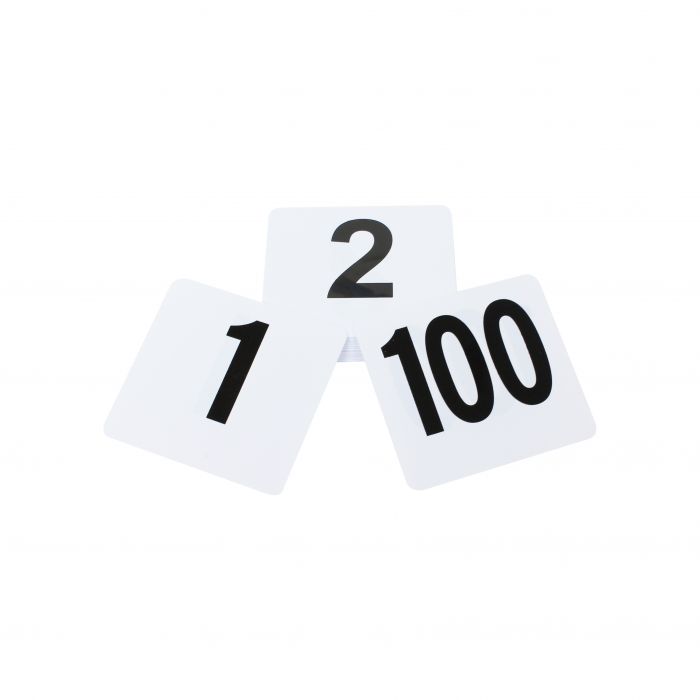 Plastic number signs. You get 1 thru 100 one of each for a total of 100 pieces. Great for sliding into a holder on a table or just for a customer to hold. They measure roughly 4" x 4" each.