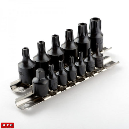 Drop forged, chrome vanadium steel, heat treated, black oxide finish for durability. • Use for tamper-proof star fasteners in today's car, trucks, SUVs, appliances, etc. Contents: • 6 pcs 1/4" drive star bit socket sizes: SD-10, 15, 20, 25, 27, 30 • 6 pcs 3/8" drive star bit socket sizes: SD-40, 45, 47, 50, 55, 60 • 1 pc 3/8" drive (f) x 1/4" drive (m) adapter