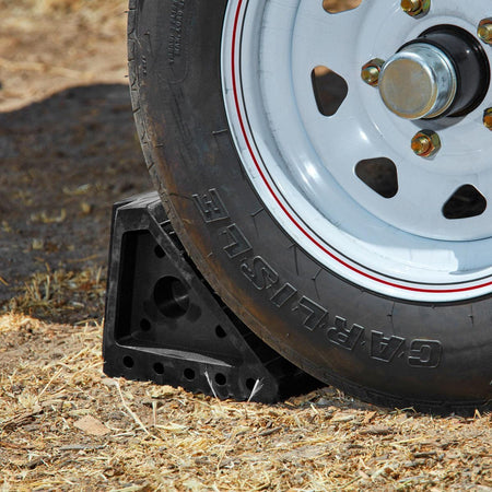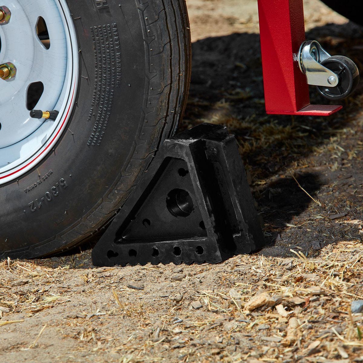 This durable, solid rubber wheel chock prevents vehicles from rolling during maintenance or storage. The lightweight wheel chock features all-weather construction for reliable performance in any climate and a molded grab handle for easy positioning. With a nonslip surface for superior traction, this solid rubber wheel chock is an essential safety item for vehicle repair or storage.