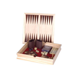 6 in 1 game set with chess, checkers, backgammon, dominoes, playing cards, poker dice.